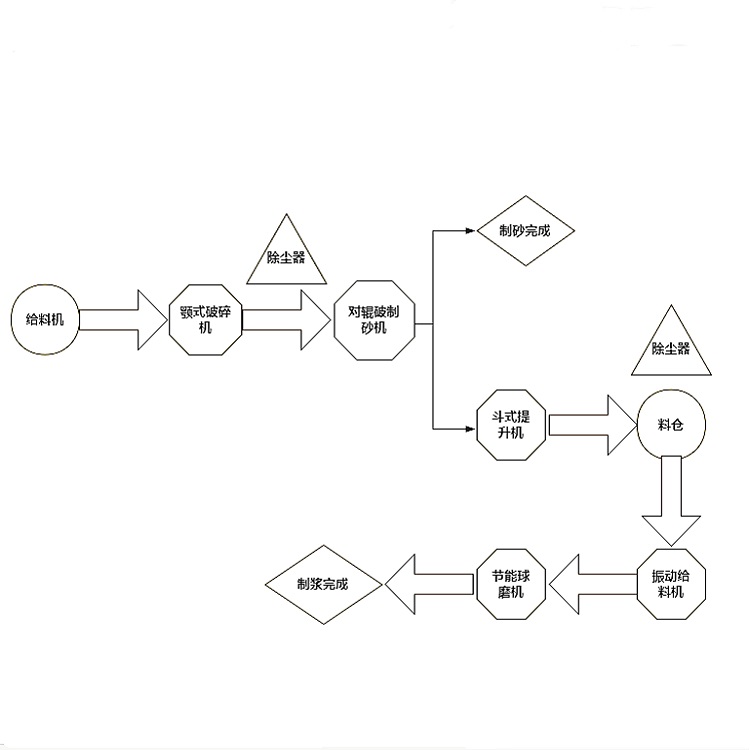 針對李總的煤矸石原料大?。?00mm),以及時(shí)產(chǎn)量的要求(100T),我們?yōu)槠湓O(shè)計(jì)了煤矸石制砂方案,需要使用到的設(shè)備有給料機(jī)、顎式破碎機(jī)、對輥制砂機(jī)等。另外李總還提到在煤矸石制砂完成后想進(jìn)一步將其制作成漿,需要使用到的后續(xù)設(shè)備有斗式提升機(jī)、料倉、振動(dòng)給料機(jī)、節(jié)能球磨機(jī)等。大家都知道石料在制砂過程中難免會產(chǎn)生大量灰塵,而國家對生產(chǎn)時(shí)的環(huán)保有一定的標(biāo)準(zhǔn),因此我們在整個(gè)生產(chǎn)線當(dāng)中配備了兩臺除塵器,以實(shí)現(xiàn)綠色環(huán)保生產(chǎn)。具體工藝流程如下: